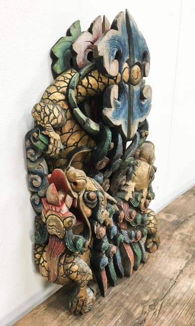 Paire de sculptures en bois représentant des lions chinois, éléments architecturaux d’une ancienne maison chinoise. Les lions chinois sont des images célèbres pour la protection des maisons et des portes en Asie. Le prix est par paire.