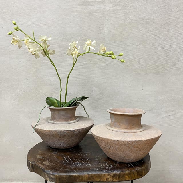 Paar antieke potten, gemaakt aan het einde van de periode van de Strijdende Staten en het begin van de Han-dynastie (rond 220 voor Christus). Kort met brede, platte schouders en grote buik. Ongeglazuurd, met een roodachtige tint en prachtige ingedrukte patronen rond het lichaam.